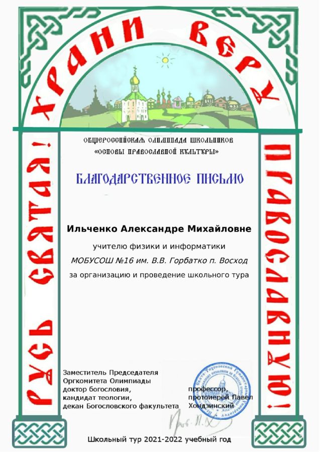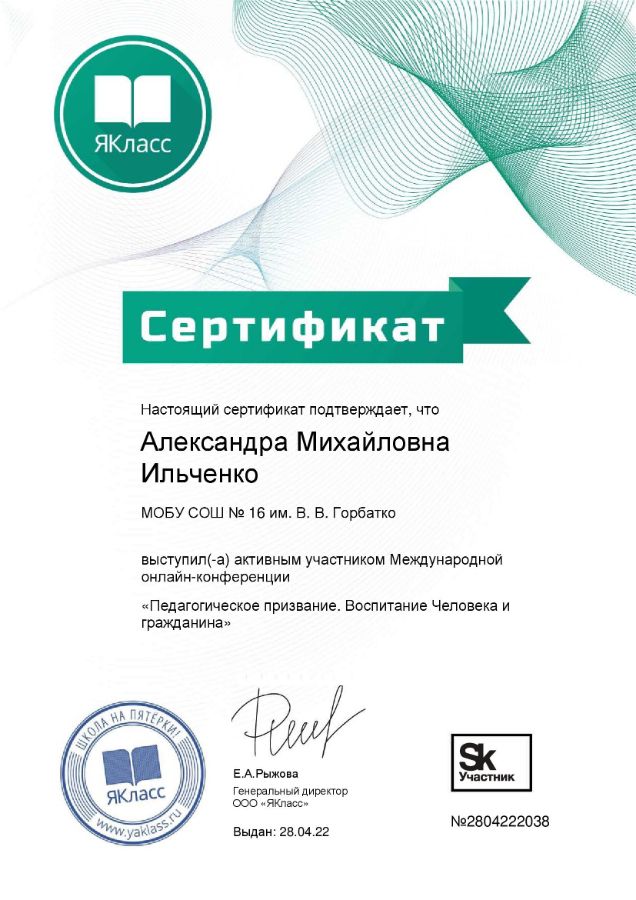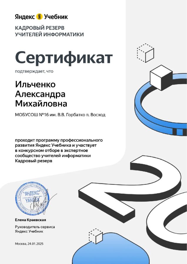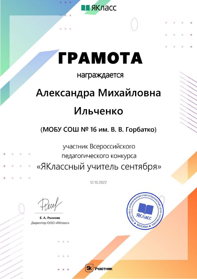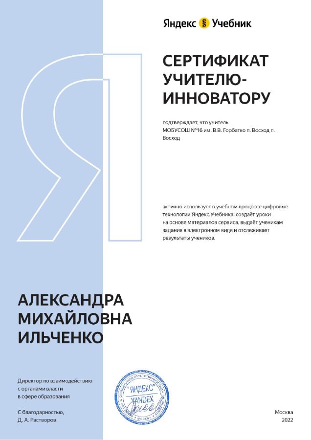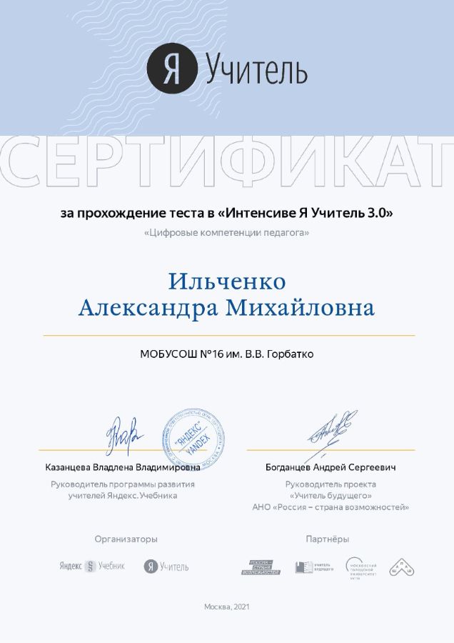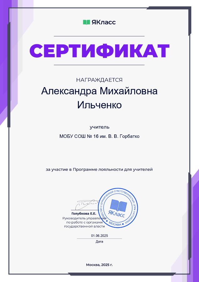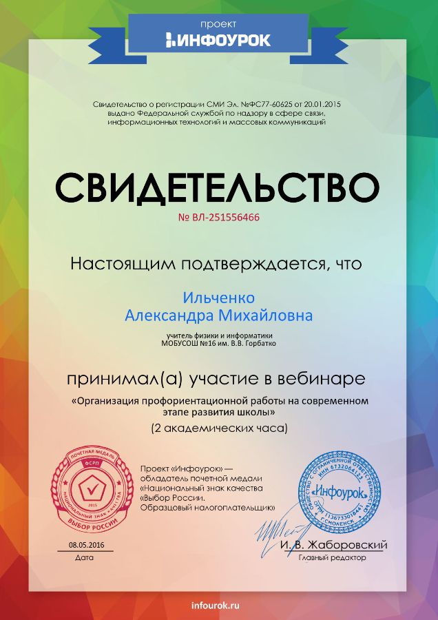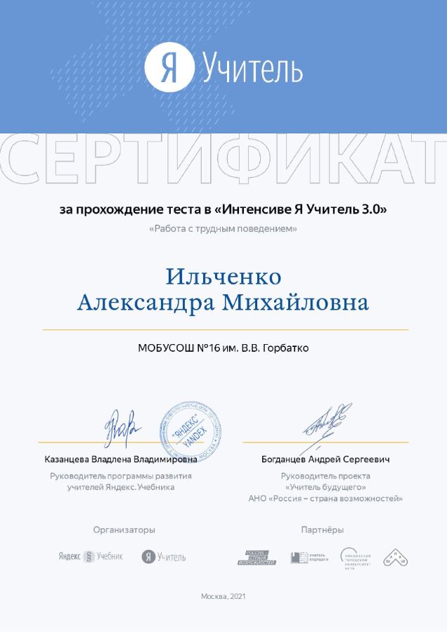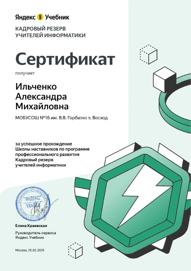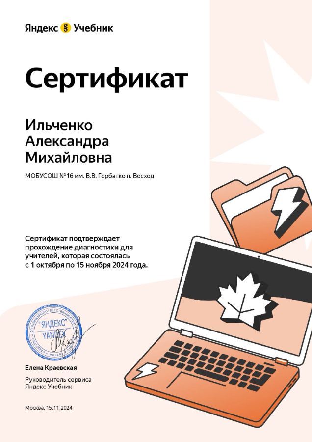 Место работы: МОБУСОШ №16 им. В.В. Горбатко п. Восход муниципального образования Новокубанский район