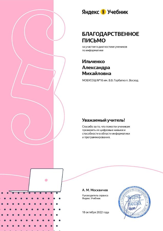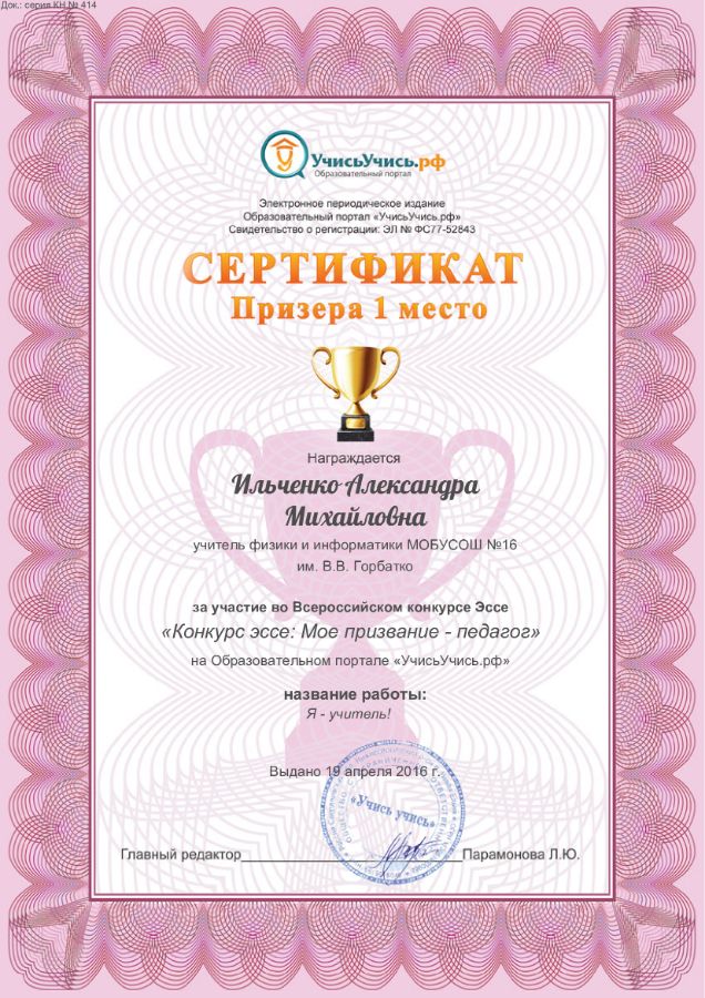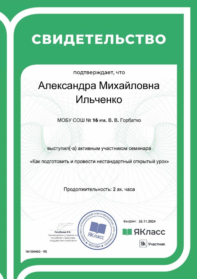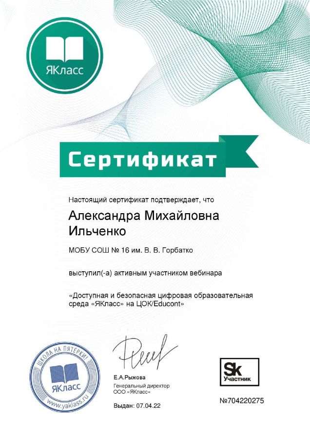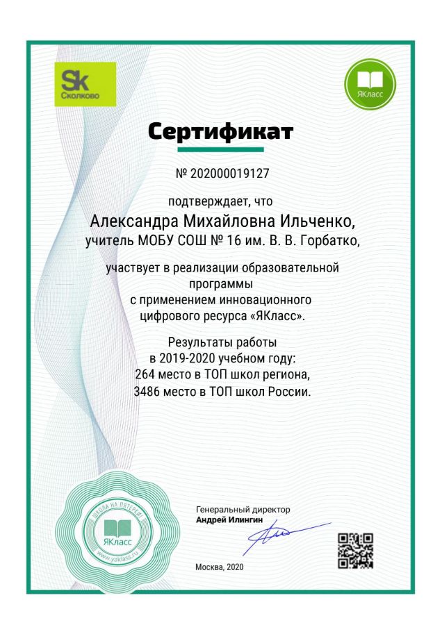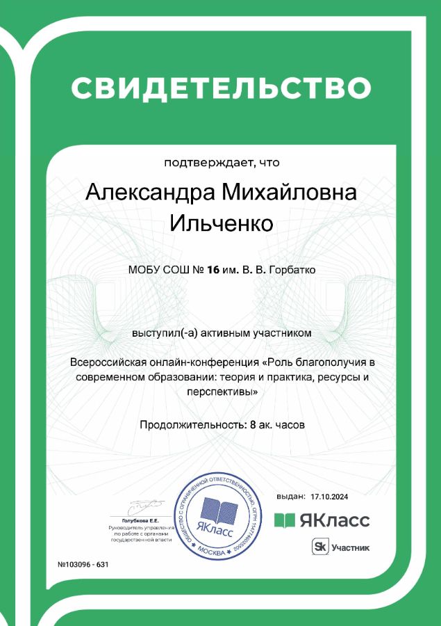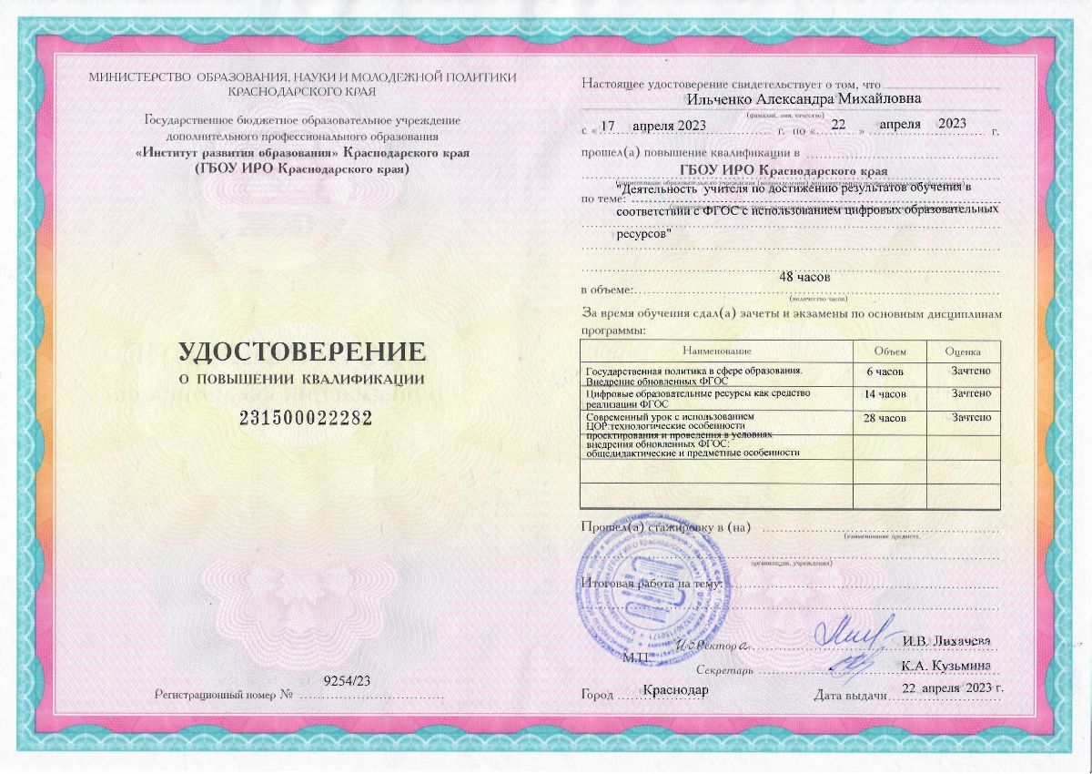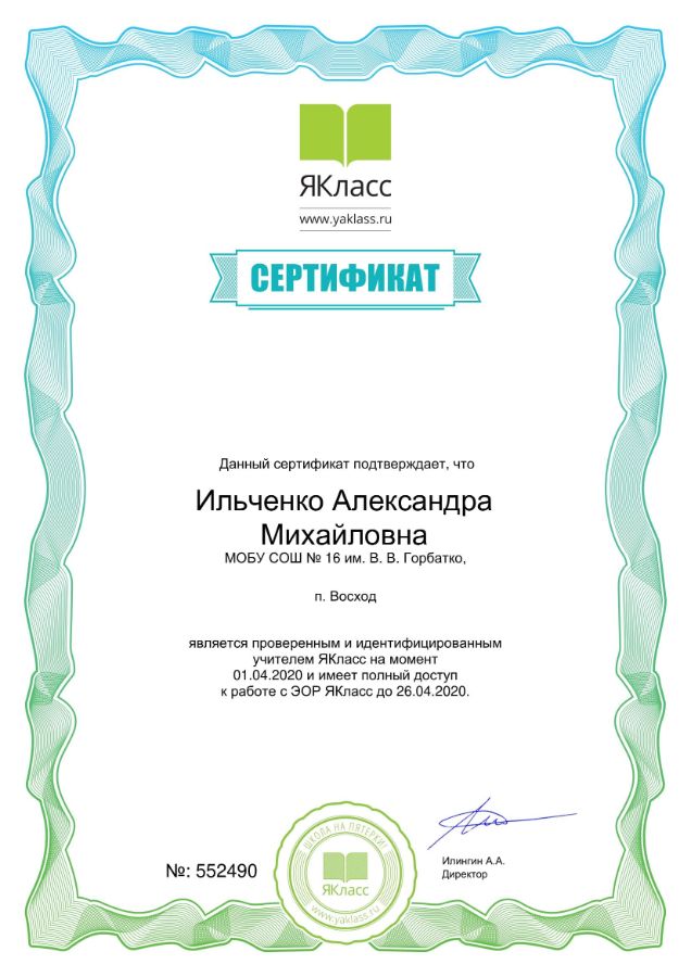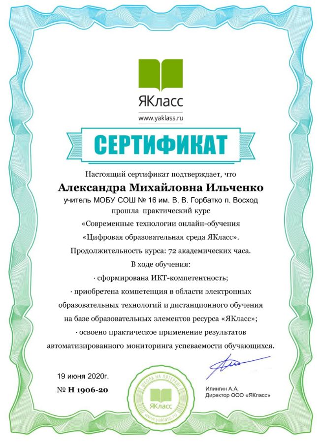 Место работы: МОБУСОШ №16 им. В.В. Горбатко п. Восход муниципального образования Новокубанский район