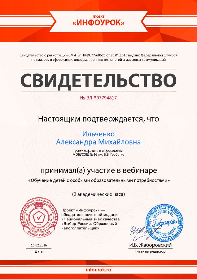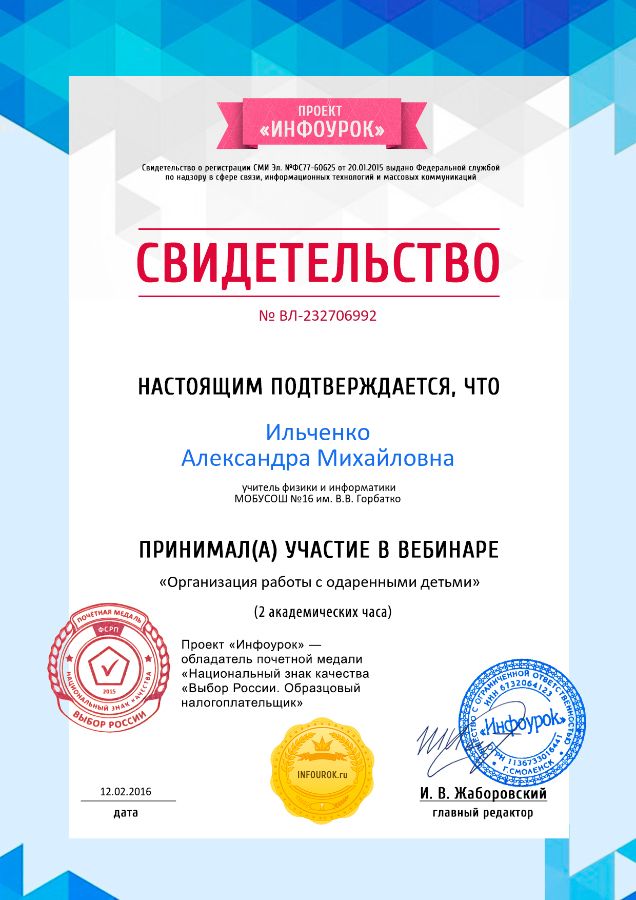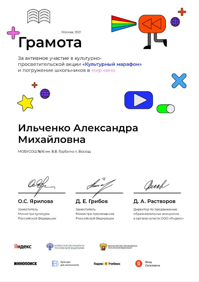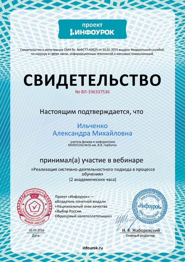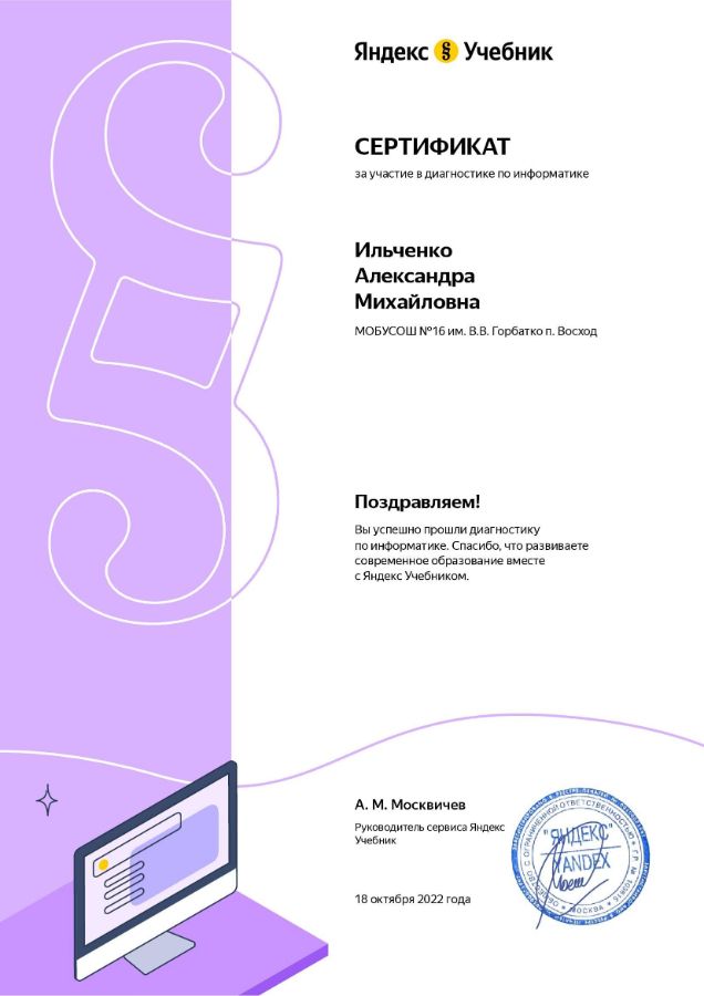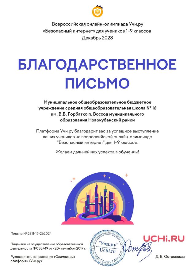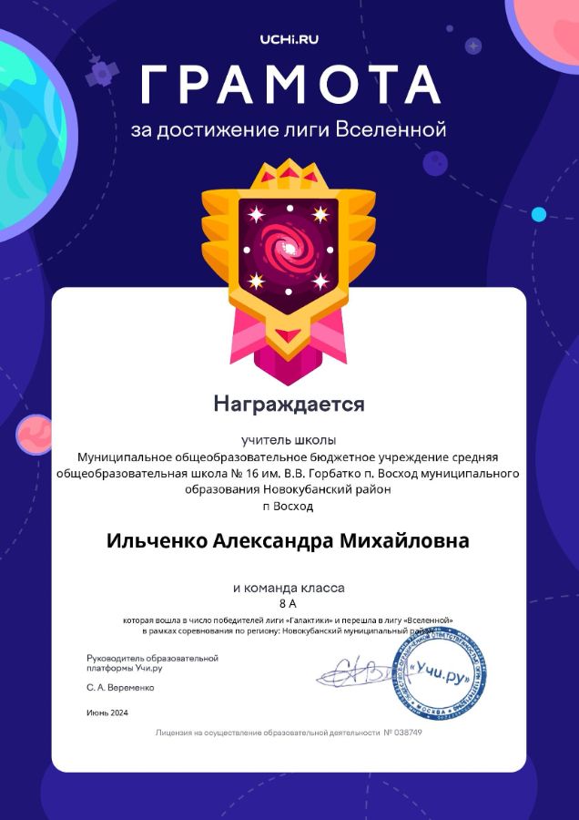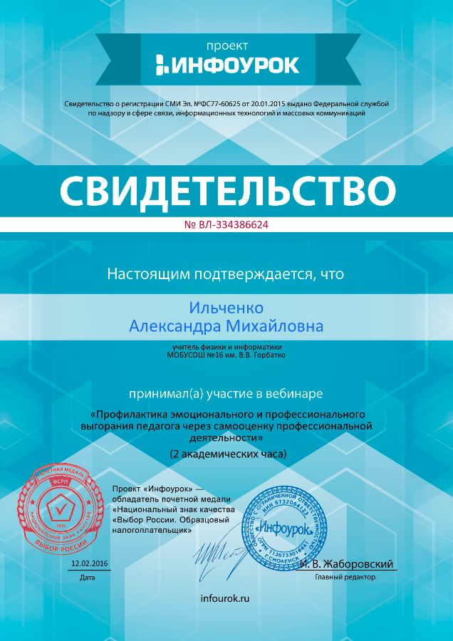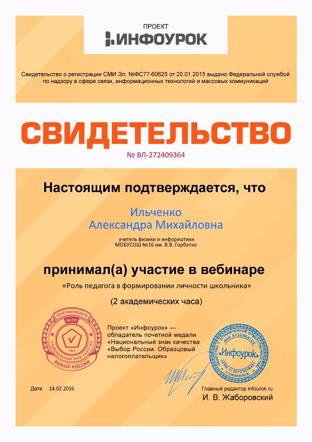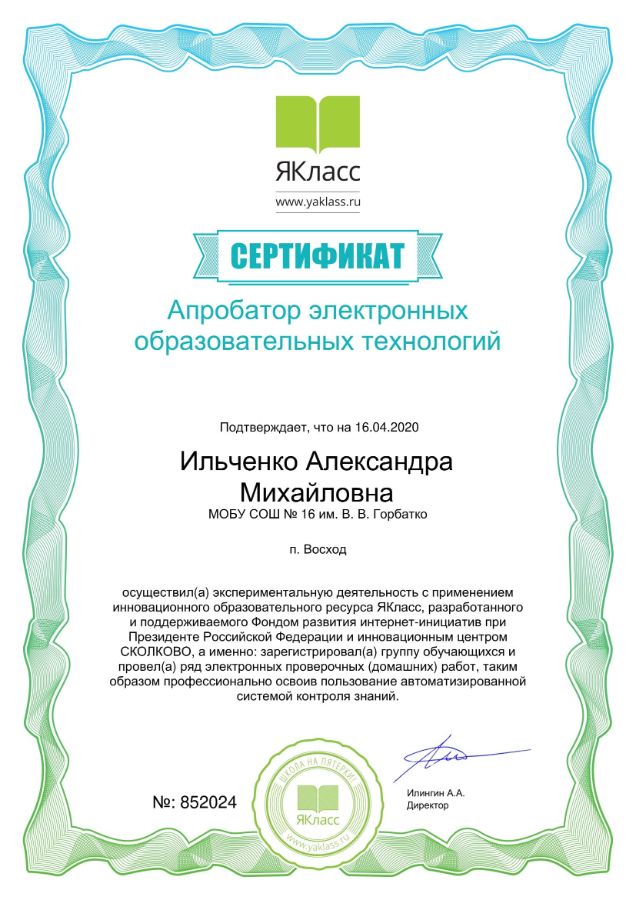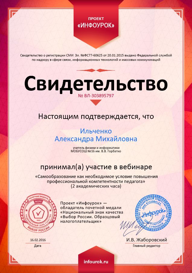 Место работы: МОБУСОШ №16 им. В.В. Горбатко п. Восход муниципального образования Новокубанский район
