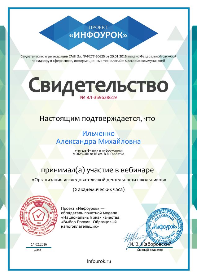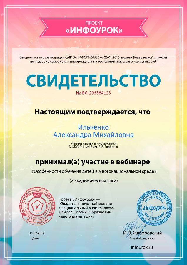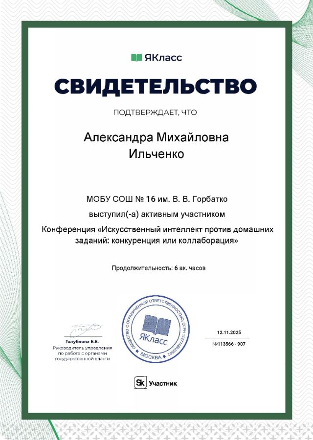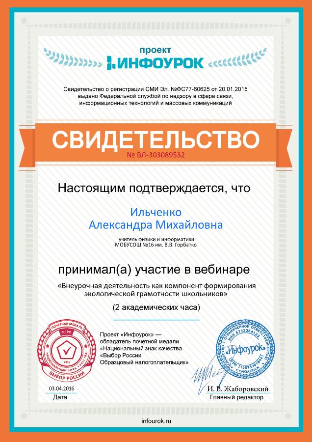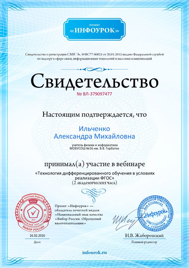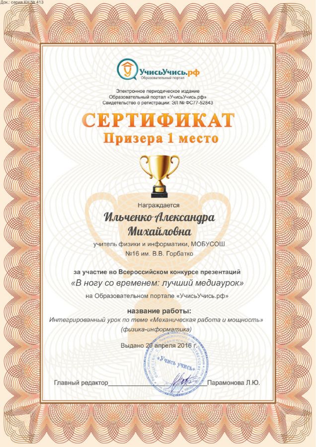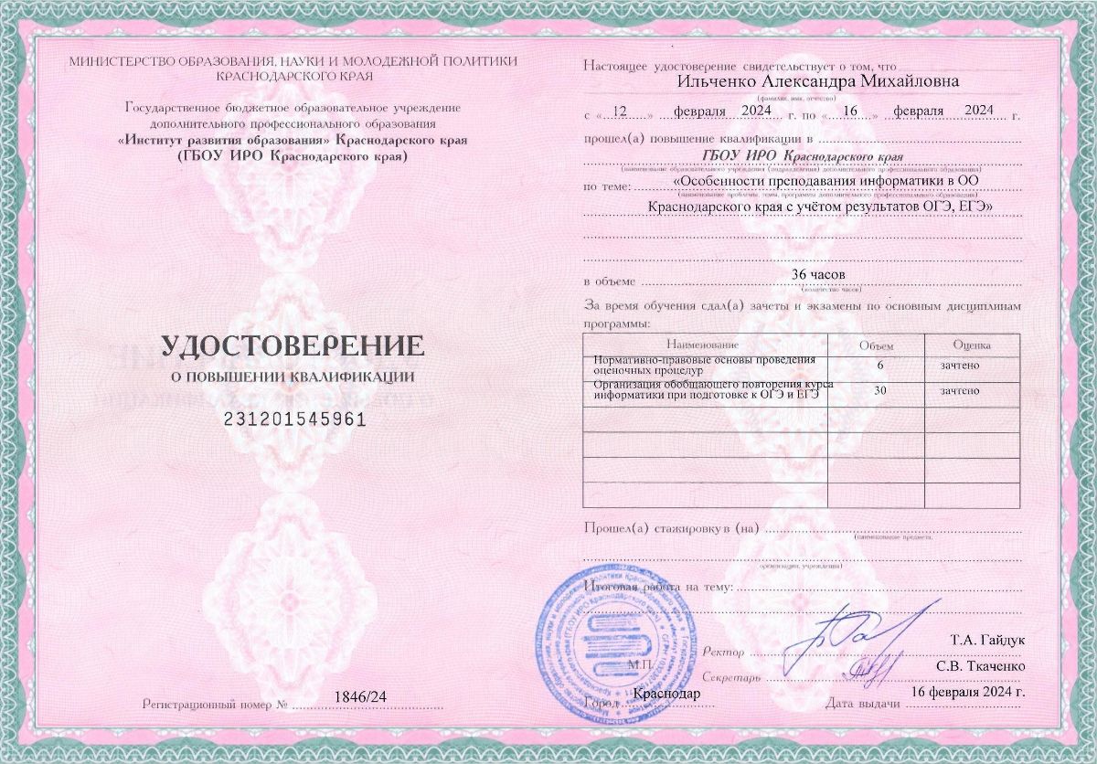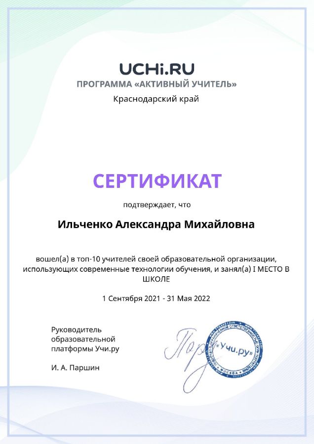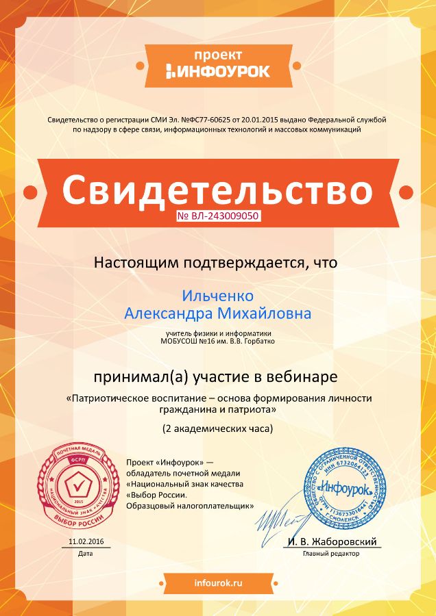 Место работы: МОБУСОШ №16 им. В.В. Горбатко п. Восход муниципального образования Новокубанский район