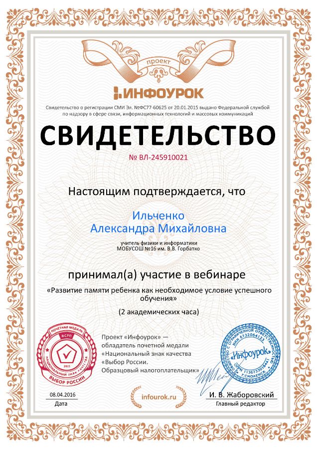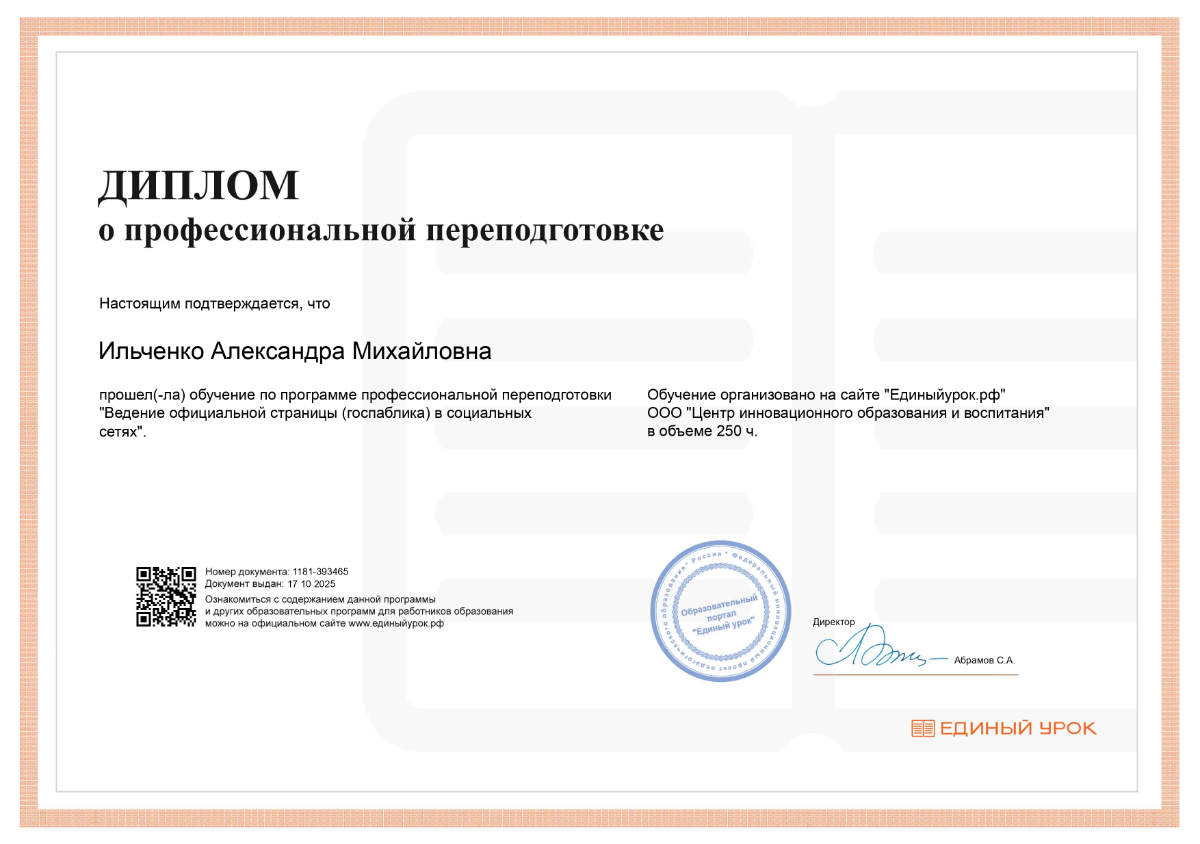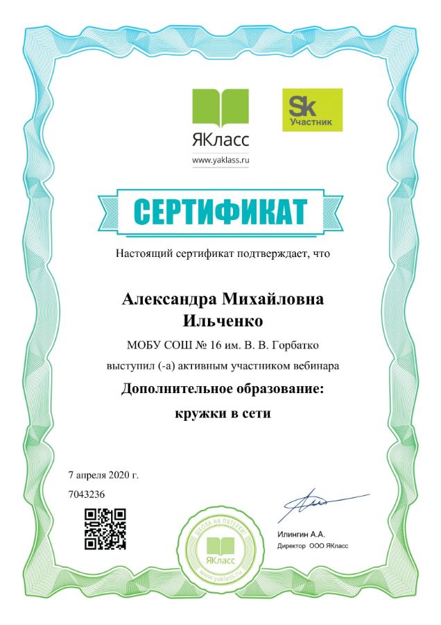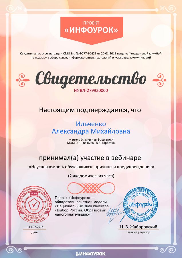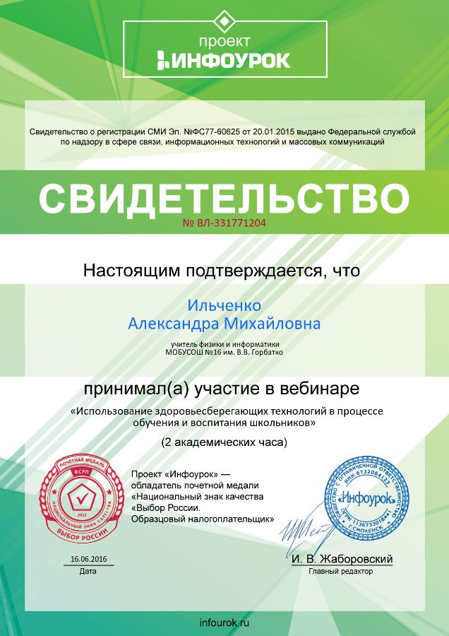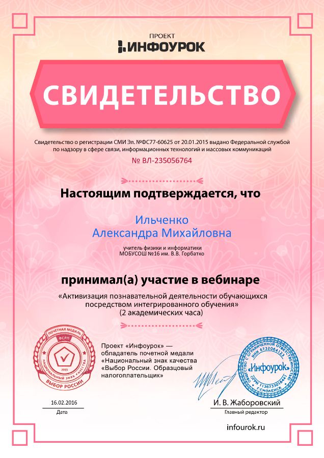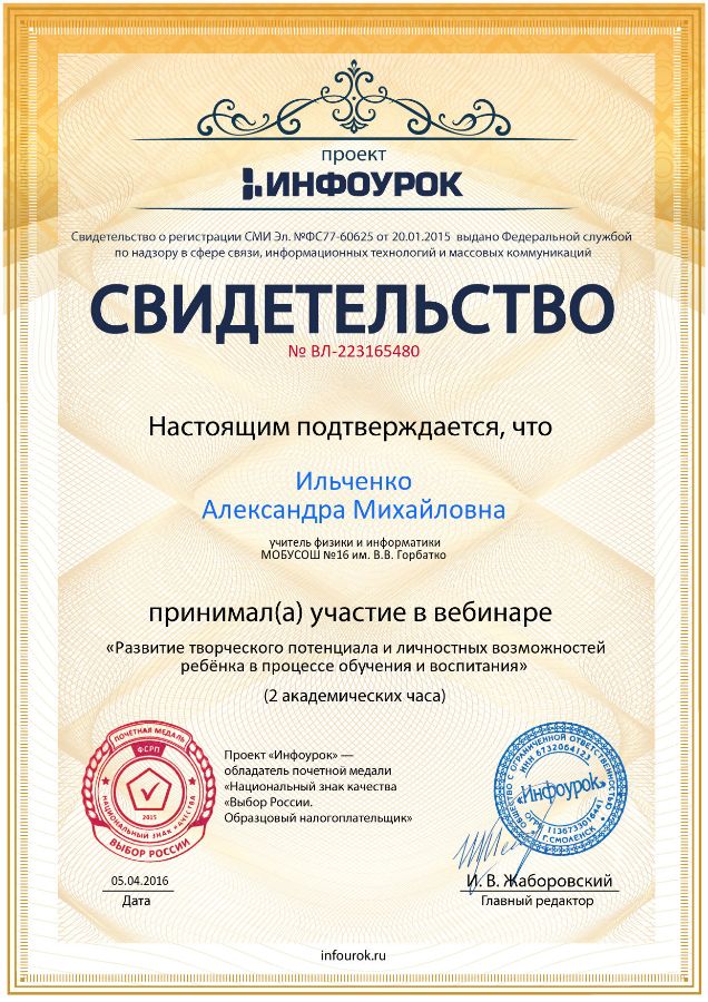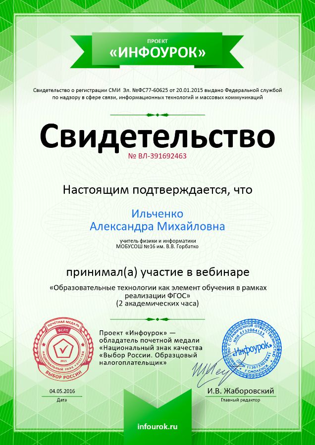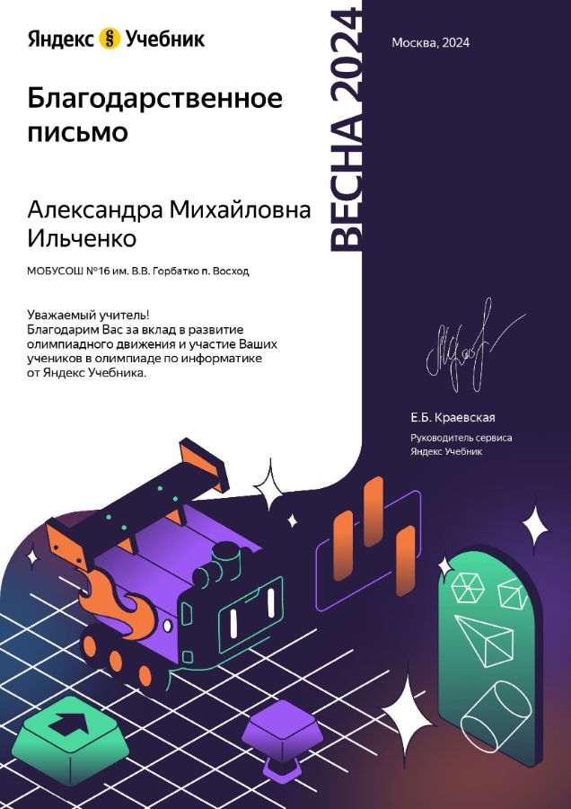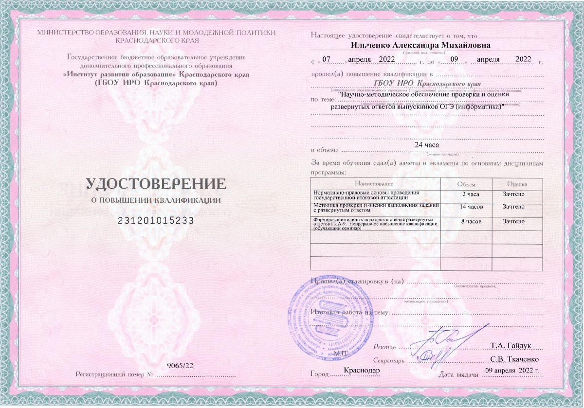 Место работы: МОБУСОШ №16 им. В.В. Горбатко п. Восход муниципального образования Новокубанский район